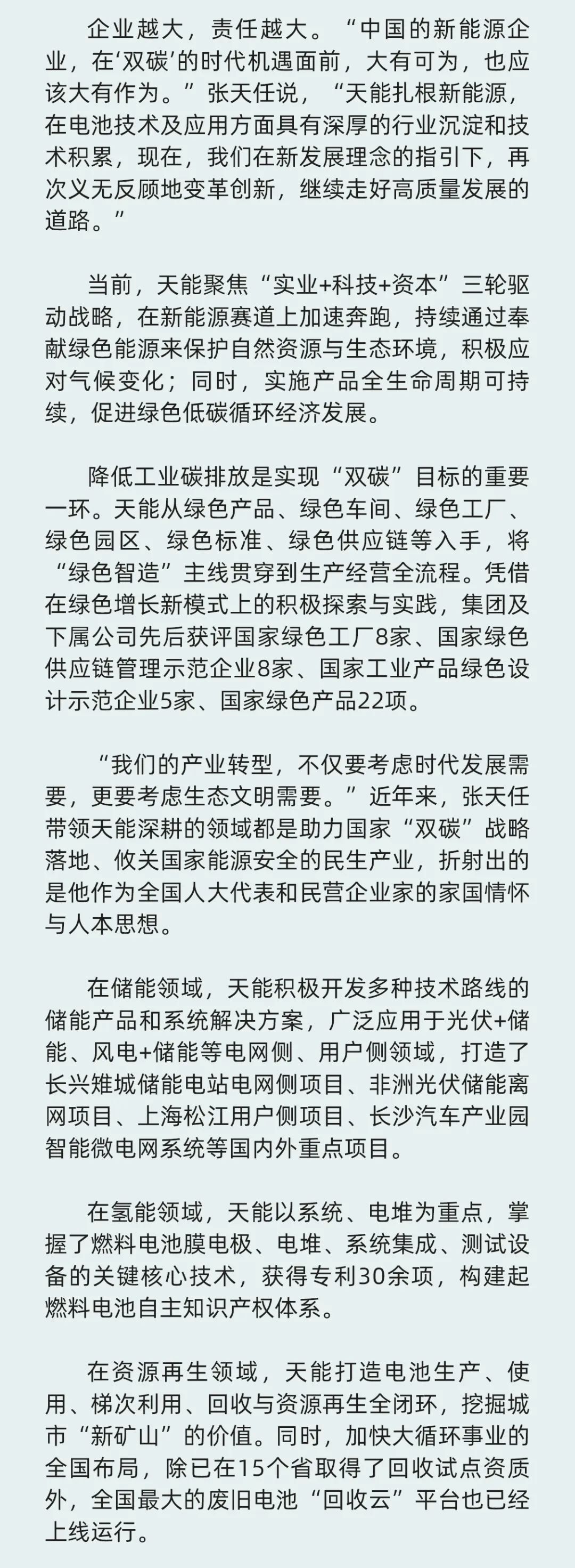 全国“两会”正在进行中,全国人大代表、ld乐动控股集团董事长张天任提出了高质量建设新型储能体系、尽快出台强有力氢气补贴、加强回销一体化示范项目推广、鼓励各类电池技术平行发展等具体建议,为推动能源转型,守护绿水青山积极建言献策。
